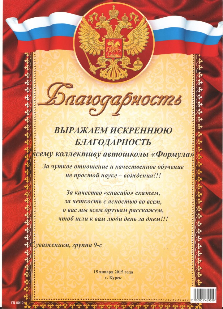 Хочу выразить благодарность преподавателю ПДД Губанову Геннадию Георгиевичу.Ещё хочу поблагодарить своего инструктора Бурцева Романа Юрьевича. Спасибо вам за те навыки которые вы мне дали.Всем рекомендую УЦ "Формулу"!