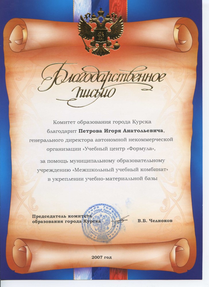 Выражаю благодарность автошколе "Формула" за отличное обучение. Отдельно хочу отметить замечательного инструктора и наставника Чуйкова Алексея Викторовича!!! Он научил меня вождению по городу с абсолютного нуля, подробно объяснял и показывал на практике все ситуации, встречающиеся на дорогах: как действовать при интенсивном движении, в пробке, на железно-дорожных переездах, на перекрестках с круговым движением, вне города, при технической неисправности или аварии, ознакомил с основами строения автомобиля. Внимательный, понимающий, опытный, он, на мой взгляд самый лучший инструктор по вождению! Очень довольна, что попала именно к нему. Огромное Вам спасибо!!! Буду рекомендовать Вашу автошколу и именно этого инструктора!