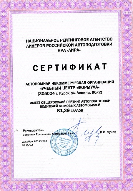 Хочу выразить огромную благодарность коллективу автошколы «Формула», расположенной по адресу ул. К. Воробьёва 7а. Без проблем помогли получить права с первого раза. На теоретических занятиях были в полной мере раскрыты все темы, учебные видеофильмы выводятся на экран как дополнение к сказанному преподавателем. Вопросы, касающиеся травм и оказания первой медицинской помощи, разбираются медицинским работником, который наглядно показывает все на специальных манекенах. Учебные комнаты оборудованы проектором и ноутбуками для выполнения тестовых заданий. В отдельности хочу поблагодарить инструктора Чуйкова Алексея Викторовича, который научил вождению по всему городу, а также в пробке, на жд переездах, за городом, объяснил, как действовать при аварии, ознакомил с ситуациями, которые могут привести к ДТП, научил видеть ситуацию на дороге наперёд и быстро принимать нужное решение. Занятия проходили в удобное время, которое заранее оговаривалось. Проблем с автомобилем никогда не возникало.